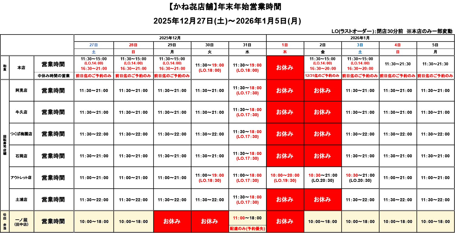 2025年11月25日 / 最終更新日 : 2025年11月25日 admin 一ノ蔵からのお知らせ 年末年始 営業時間のご案内 今年もかねきをご利用いただき誠にありがとうございました。 一年の結びに、新年の始まりに、かねきのお寿司を囲まれてはいかがでしょうか。 一ノ蔵店は年末年始の12/29(月)〜1/1(木)、営業時間と内容に変更がございます。※表は拡大してご覧になれます。 ※12/31(11時〜18時)の営業は、「ご予約の生寿司を配達」のみいたします。(事前のご予約分が優先となります)